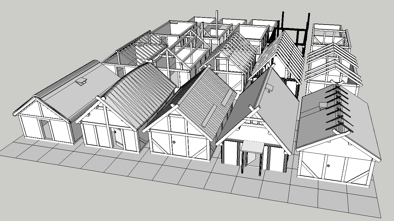 В этом же стиле выполнен торговый причал из 6-ой версии, и мне бы хотелось развивать эту идею дальше. При строительстве городских домов викинги использовали дерево и глину для каркаса, а для крыши, в большинстве случаев – солому. В домах не было окон и труб: огонь разводили прямо посреди комнаты, а дым выходил через специальное вентиляционное отверстие в крыше или фронтоне. Здания должны быть максимально историческими, что не так-то просто было реализовать – я нашёл только рисунки в книгах и фотографии реконструкций в музеях под открытым небом. Пришлось использовать несколько источников, и одним из них стал даже сериал «Викинги». Вторая справа модель – почти что дом Рагнара, где он, будучи фермером, жил со своей маленькой семьёй в 1 сезоне. ;)
