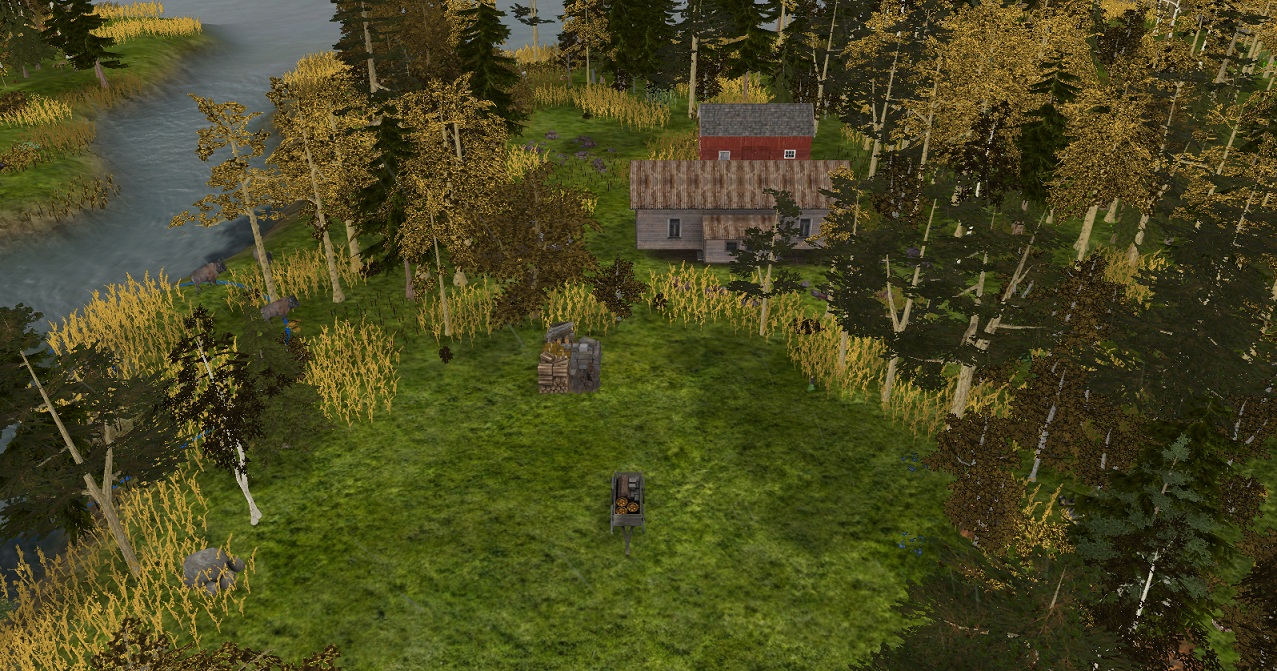 we can gather enough food. we do need more firewood than can be collected. a thatch hut will work the hay field. these bannies can burn it to keep their houses warm. beyond the meadow, we zone a forest. this will provide logs for lumber and firewood.