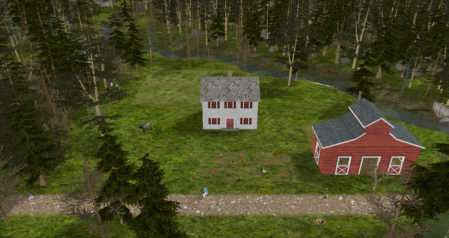 slowly, we worked to clear land and fence a larger pasture for the cows. they will be split from the horses and pigs. after Elisbell turned 15, we built 1 house. as the animals breed and multiply, we will need more grain. a deco corn field is cleared and planted.we extended the hay barn so that it will store thatch. now that we have more storage space, we could clean up all the rocks and more trees.a CC town arrival will be used for reports.